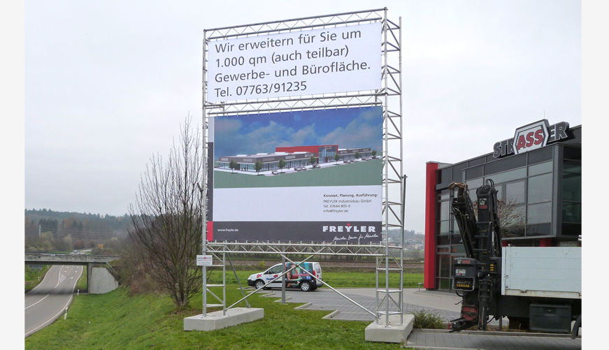 Ihre Werbung wird auf eine hochwertige Plane aufgedruckt und durch ein Fixierungssystem fest mit der Halterung verbunden. Gedruckt wird mit modernsten und umweltfreundlichen Druckern, so wird der Druck brillant und langlebig. Jedes denkbare Format ist möglich, das ermöglicht Ihnen einen absolut flexiblen Einsatz. Als Unterkonstruktionen kommen modulare Aluminiumfachwerke zum Einsatz, montiert auf mobilen Betonfundamenten und sind statisch berechnet. Die Angebotspreise verstehen sich einschließlich Transport zum Aufbauort, Montage, Vorhaltung während der Mietzeit, Abbau und auf Wunsch Zuführung der Schilder in eine umweltgerechte Wiederverwertung.
